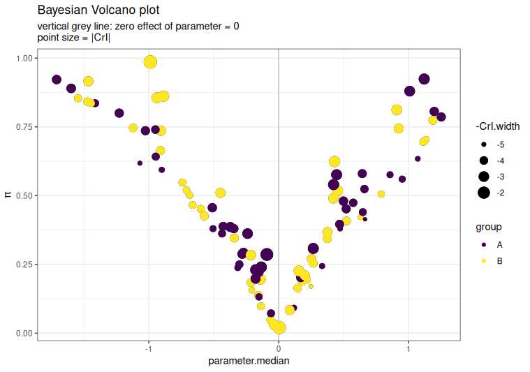 Traditional volcano plots address this for frequentist analyses by plotting fold-changes against –log(p-values). We introduce Bayesian volcano plots that instead visualize the posterior mean effect size of parameter \(i\) (\(\theta_i\)) against the probability, \(\pi_i\), where the \(\pi_i\) quantifies the posterior probability that \(\theta_i\) is not equal the null effect. This directly highlights both magnitude and biological relevance. While Sousa et al. (2020) conceptualized Bayesian volcano plots, our R package provides the first practical implementation for automated \(\pi_i\) calculation and visualization of complex biological effects.
