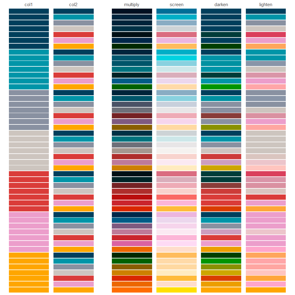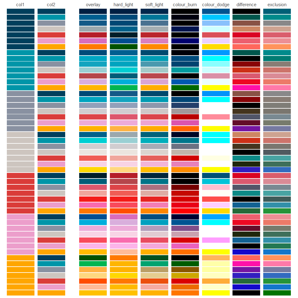 The objective of blends is to blend colour palettes using blend modes, such as multiply and screen.