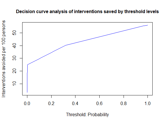 View decision curve analysis results like ‘net benefit’ at various thresholds of key interest at these percentiles: 0.01, 0.05, 0.10, 0.25, 0.50, 0.75, 0.90, 0.95, 0.99.