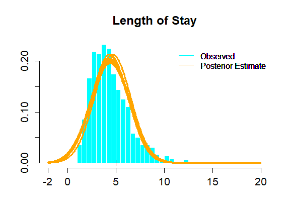 There are are options for a model summary and graphing. For example, below is a Posterior Predictive Check on how well our model fits the data. Estimating center and spread for hospital length of stay. A model with a gamma likelihood would fit better but this will do for demonstration purposes.